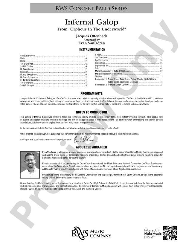 Jacques Offenbach's "Infernal Galop", or "Can-Can" as it is more often called, has been reimagined throughout history. From classical composers such as Saint-Saëns, to more modern uses in movies, television, and even video games, the timeless appeal of Offenbach's melody is without question. Evan VanDoren's new arrangement for concert band is a perfect addition to any concert. Particularly effective as a closing selection or encore, this recognizable flourish will have your audience on their feet. Highly recommended!
