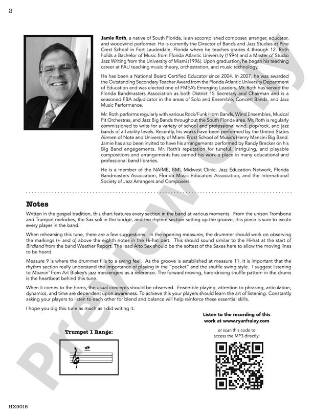 Brimming with optimism, this original chart from Jamie Roth pulls from gospel tradition in a bright and cheerful full-band setting. After a straight-eighth-note introduction builds to a huge plagal cadence, the band emerges in shuffle swing time with each section featured in turn. Solo changes are provided for Piano, Alto 1, Tenor 1, Trumpet 2, Trombone 2, and Guitar. A transcription of the Tenor Sax solo from the recording is provided. Detailed rhythm section parts include written bass lines and suggested piano voicings. Great writing with lots of tasty lines for every part in the band! (Top trumpet note: C6)