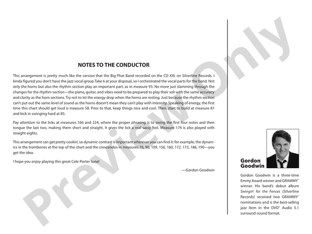 As recorded on the Silverline Records album XXL (CD and DVD Audio) by Gordon Goodwin's Big Phat Band. Originally written for vocal group Take 6 and the Big Phat Band, the chart was re-orchestrated for big band! A wonderful tune by Cole Porter and another phenomenal chart by Gordon, THIS CHART SWINGS. Jazz for alto 1 and an optional flute double for alto 2. If you have a hot, experienced band, this chart is for you!