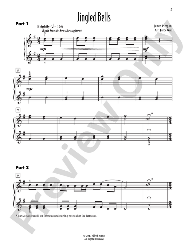 Written for one piano, six hands, this is a delightful arrangement of "Jingle Bells." Performance notes are added that, when followed by the three performers, turn the piece into a mini comedy-drama. Following a short introduction, performer 2 begins the arrangement with the chorus of "Jingle Bells." Two variations of the verse follow. One is set in 3/4 time and the other is a transition, leading back to the chorus in a minor key. The lively ending will bring any audience to their feet. A Federation Festivals 2024-2028 selection.
