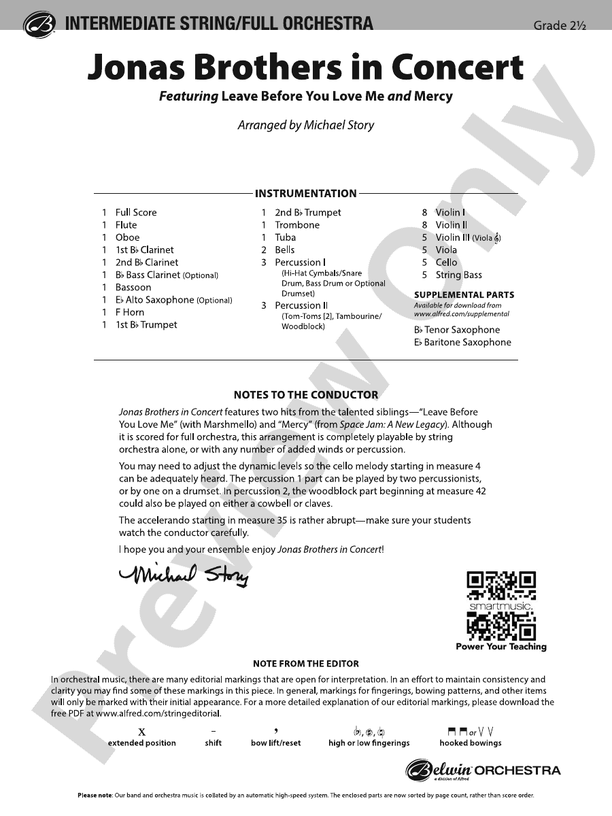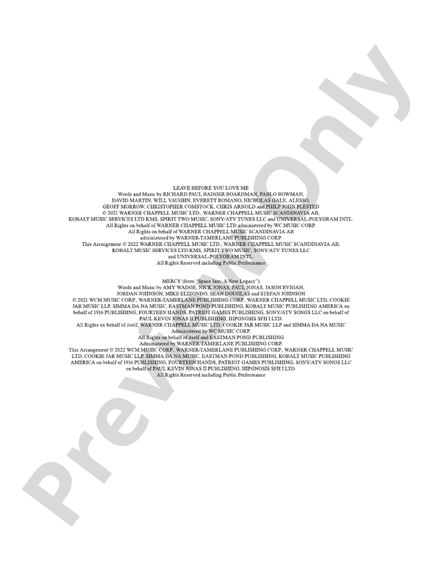 Jonas Brothers in Concert contains two hits from the talented siblings---"Leave Before You Love Me" and "Mercy" (from Space Jam: A New Legacy). Although it is scored for full orchestra, this arrangement is completely playable by string orchestra alone, or with any number of added winds or percussion. (3:20)