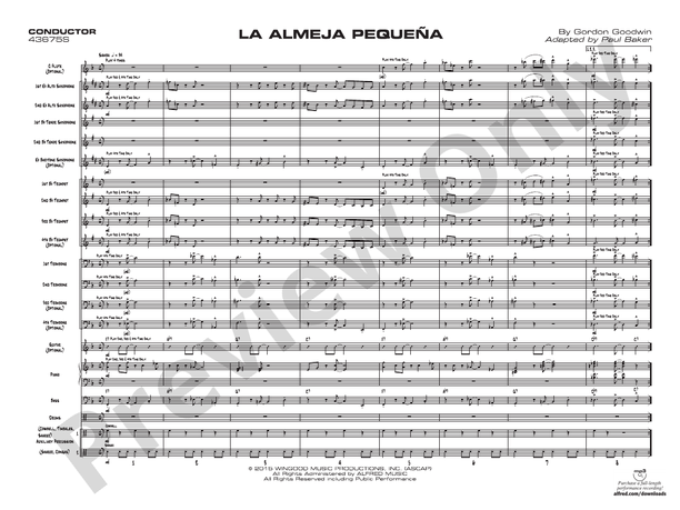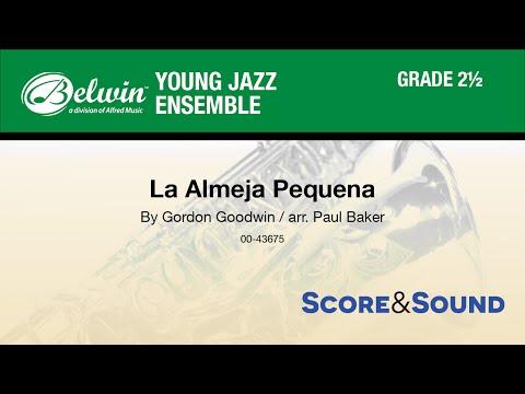 Originally done by the Big Phat Band, La Almeja Pequena arranged by Paul Baker is a samba played around 90 BPM in cut time. It's a very exciting Latin chart with solos for alto 1 and trumpet 2, and the trumpet 1 range is to written G on top of the staff. There are two auxiliary percussion parts, plus the usual optional parts to include flute, clarinet, and vibes. (4:27)