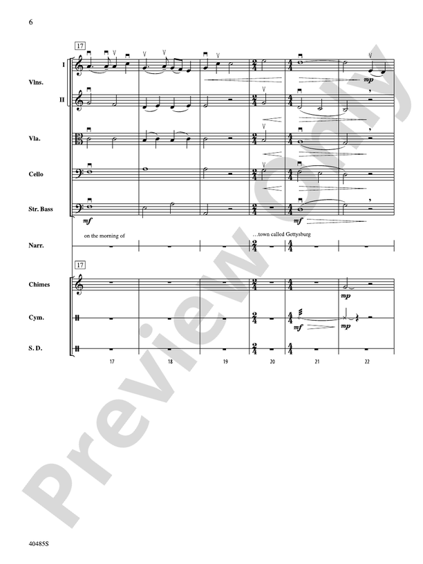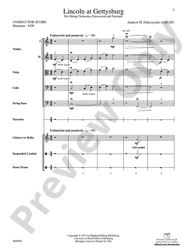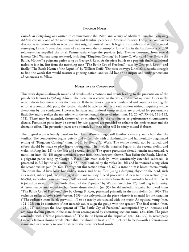 Written to commemorate the 150th anniversary of the Gettysburg Address, this piece is a guaranteed centerpiece for any orchestra concert. This imaginative original work for string orchestra, narrator, and percussion conveys the intense emotional and patriotic drama of Lincoln's most famous words, including events leading to the speech. Recalling several Civil War-era melodies, the music complements a richly descriptive narration---offering opportunities to involve guest speakers in the concert---and culminates in a moving finale that will bring the audience to its feet.