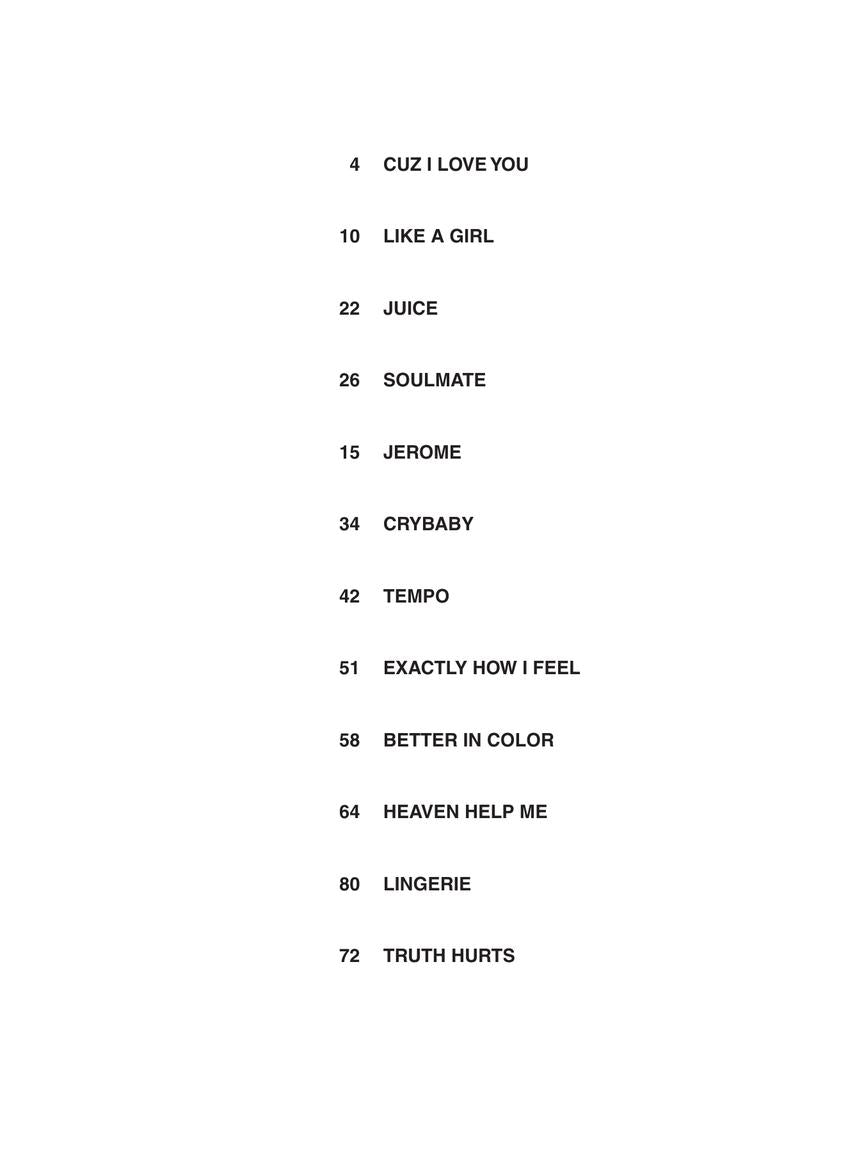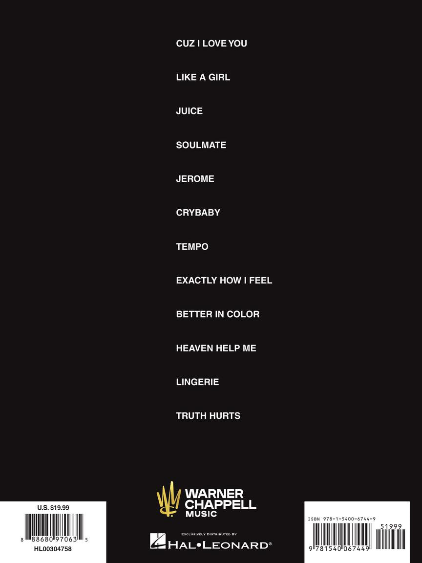 A dozen songs from the 2019 breakthrough album by this singer, songwriter, rapper, actress, and flautist. This matching folio includes piano/vocal/guitar arrangements of the songs: Better in Color • Crybaby • Cuz I Love You • Exactly How I Feel • Heaven Help Me • Jerome • Juice • Like a Girl • Lingerie • Soulmate • Tempo • Truth Hurts.