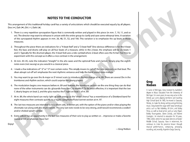 A holiday swing chart on this classic, performed around 130 BPM, with suggested solos written for alto 1, trumpet, 1, tenor 1, and trombone 1. Easy brass ranges with a shout chorus that modulates to A-flat with a clever glissando for trombones into the new key. Nice chart for the holidays. (3:40)