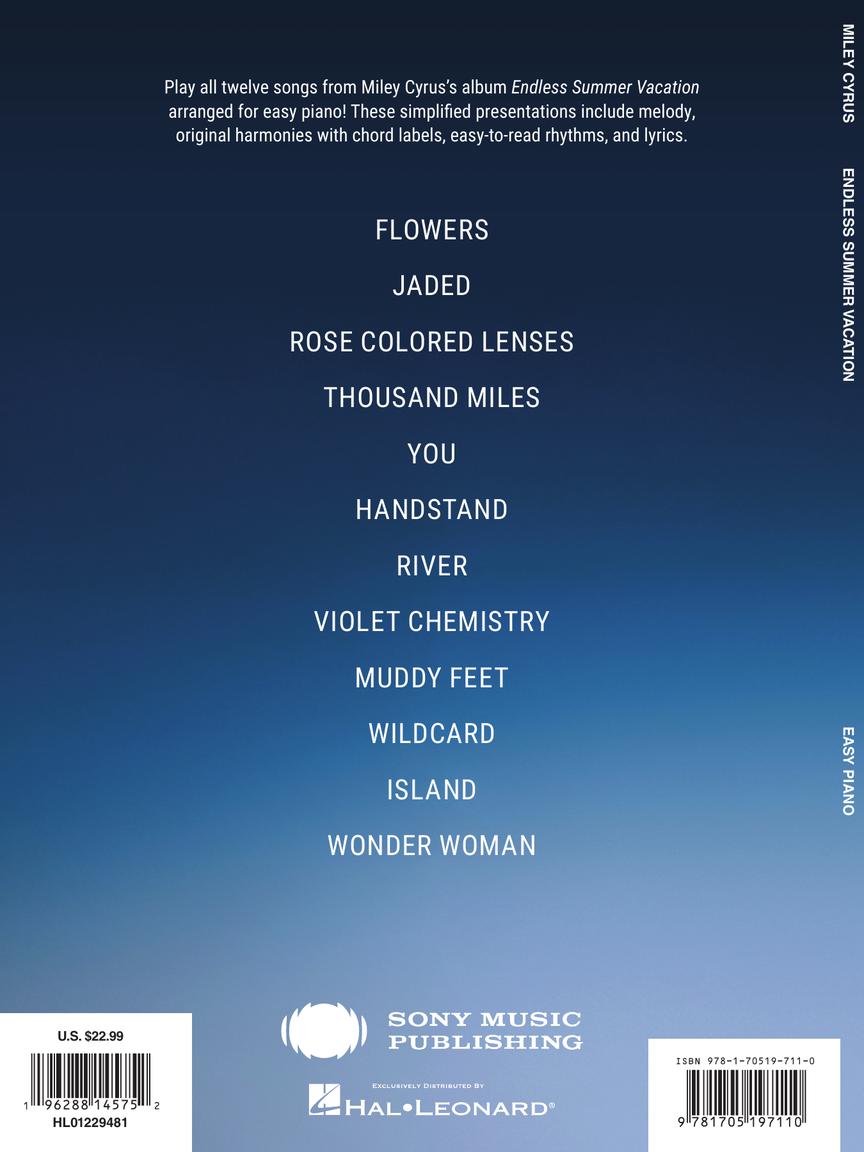 Miley Cyrus's 8th studio album was one of the most anticipated new releases of 2023 thanks to the runaway success of its debut single “Flowers” which topped the Billboard Singles chart for weeks at the start of the year! Our matching folio features all twelve songs arranged for easy piano with lyrics. Titles include: Flowers • Handstand • Island • Jaded • Muddy Feet • River • Rose Colored Lenses • Thousand Miles • Violet Chemistry • Wildcard • Wonder Woman • You.