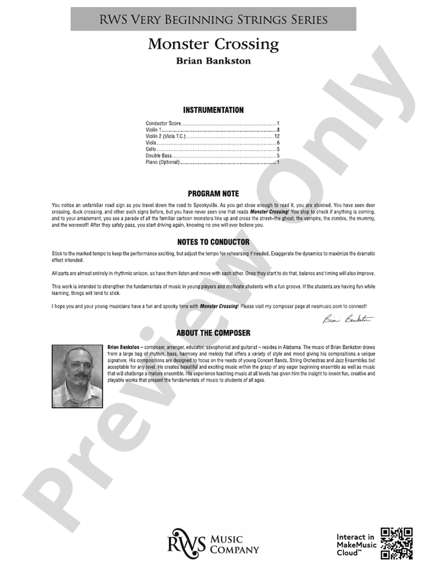 Take your students on a field trip to Spookyville with this fun and easy groove. Set in E minor, *Monster Crossing* creates a mysterious, eerie Halloween vibe, but with a cartoonish twist. With limited range and quarter- and half-note rhythms, it's perfect for any concert, especially a Fall or Halloween performance. Monster Crossing is sure to be a crowd-pleaser!