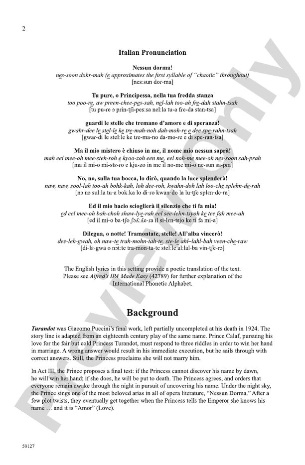 Looking for that ultimate finale, encore, or jaw-dropper? Don't miss this iconic Italian operatic theme, smartly arranged for TBB choirs. With carefully constructed voice parts, an appropriate choral key, and an optional English text, this setting is well-suited for changed voices of any age. The included IPA, phonetic pronunciation guide, and background information will assist in telling a classic love story from Puccini's Turandot.