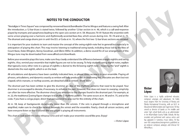 Nostalgia in Times Square, composed by Charles Mingus and arranged by Victor López, is a Grade 2.5 jazz ensemble piece published by Alfred Music in the Young Jazz Ensemble series. Swinging at around 144 BPM, this arrangement features written solos for tenor sax and trumpet, accessible brass ranges, and engaging solis and interludes. It captures Mingus’s signature blend of groove and sophistication, making it a standout choice for developing jazz ensembles.