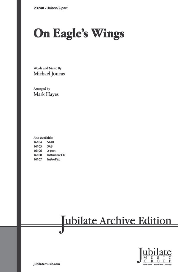 One of our best-selling anthems is now available in a unison or 2-part edition. Mark Hayes' transcendent choral arrangement of Michael Joncas' timeless song, "On Eagle's Wings," is a perennial favorite of many denominations and singers of all ages. The unforgettable text adaptation of Psalm 91 is well suited to performance by both school and church choirs throughout the year, and especially Baptism, Benediction, Funerals, Graduation, Lent and Weddings. In 4 voicings for singers of all ages.