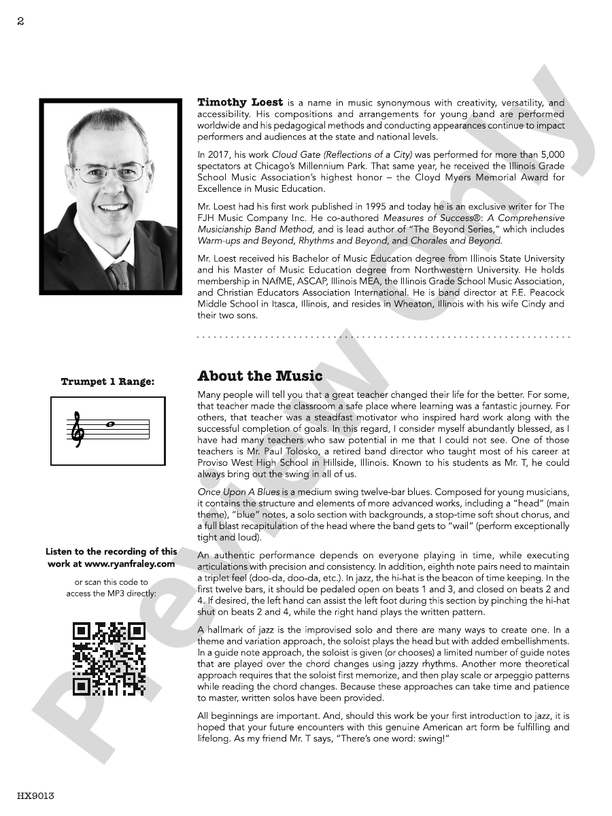 Now even your youngest players get to swing. And swing hard they will! This super achievable twelve-bar blues chart has it all, including a "head" that's as catchy as its title, an open solo section complete with backgrounds and optional written-out solos, a stop-time soft shout chorus, and a full blast restatement of the main theme. Get ready to wail! Top trumpet note: D5.