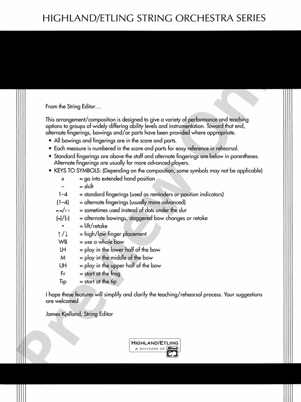 Harry Alshin brings us a well-orchestrated taste of Rossini's famous opera. Students will enjoy playing the themes they may have heard for years. The first violins get a real workout while supporting parts are animated and fun to play. Range is limited to third position for vilolins with optional position work for other instruments. An excellent opportunity to refine spiccato and martelé bowing, this piece is sure to become a favorite in the literature transcribed for strings. It also works well as a companion to Mr. Alshin's arrangement of "Figaro" from the same opera.