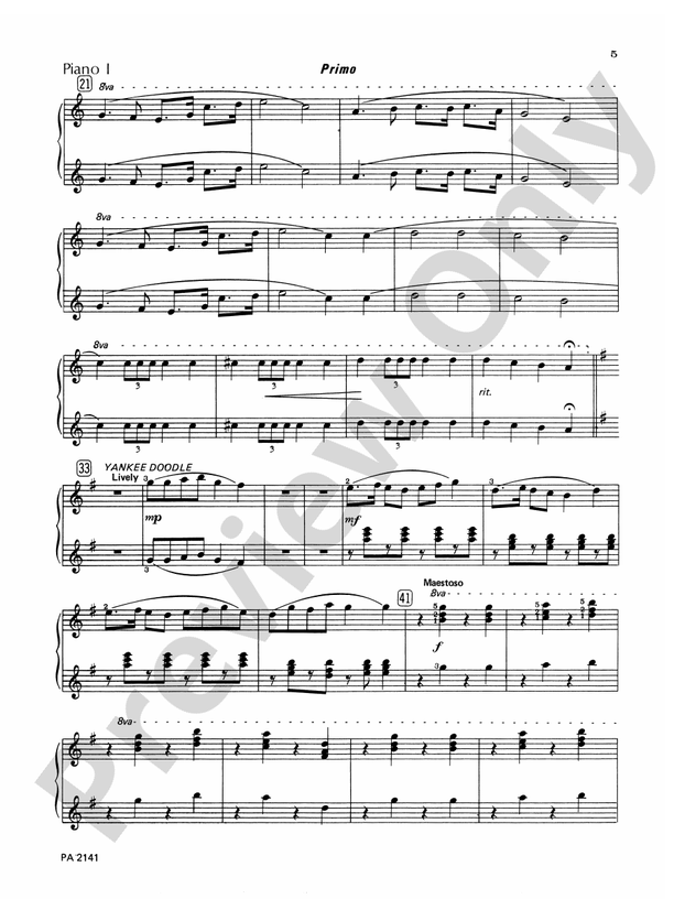 This brilliant patriotic medley arranged by Phyllis Gunther for two pianos -- eight hands or multiple keyboards and performers is a real show-stopper. Songs included in the medley are "Battle Hymn of the Republic," "Yankee Doodle," and "America the Beautiful." Each part gets a chance to play both melody and accompaniment in this lively and skillful arrangement. A Federation Festivals 2024-2028 selection.