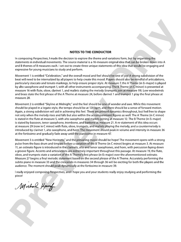 The varying moods, textures, and harmonies of a single theme are explored in this exciting three-movement work for young band, penned by Michael Kamuf, Perspectives. The piece can be played as a suite, or movements may be played individually or in any combination. An outstanding choice for your next concert or festival performance! (3:45)