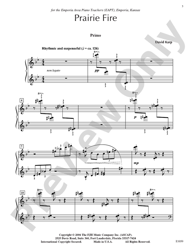 Labeled "Rhythmic and suspenseful," and written for the Emporia Area Piano Teachers of Emporia, Kansas, this duet will undoubtedly be a unique and challenging experience for any late intermediate/early advanced pianist. Both parts contain an equal amount of technical and musical demands, utilizing several eighth and sixteenth note passages, accidentals, and chromaticism.