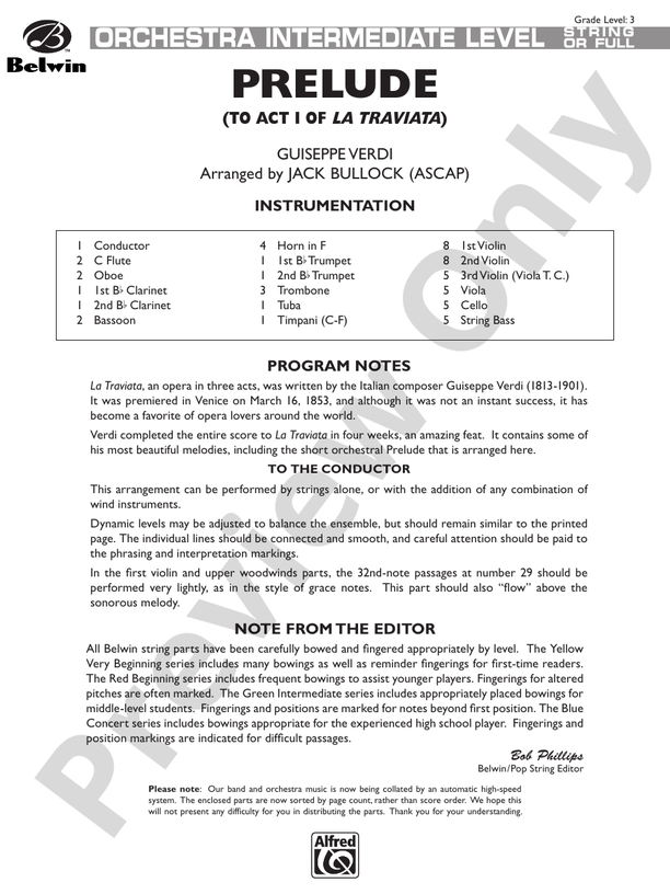 La Traviata, an opera in three acts written by the Italian composer, Giuseppe Verdi (1813-1901), has become a favorite of opera lovers the world over. It contains some of the most beautiful of Verdi's melodies and begins with a short orchestra prelude. A worthy addition to any orchestra program, this arrangement for intermediate orchestra can be performed by String Orchestra alone or with the addition of any instrument up to full orchestra.