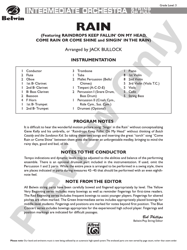 It is difficult to hear the wonderful motion picture song, "Singin' in the Rain," without conceptualizing Gene Kelly and his umbrella, or "Raindrops Keep Fallin' On My Head" without thinking of Butch Cassidy and the Sundance Kid. So taking these two songs and inserting the great "torch" song, "Come Rain or Come Shine," between them gives the listener an unforgettable medley bringing to mind the rainy days, good and bad, of life. A great tune for a Pops concert featuring skits with umbrellas! (4:30)