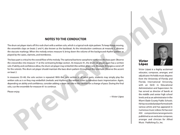 Rock on! Even the youngest band can sound great on this simple yet effective rock-jazz chart. Featuring a written drum solo, ensemble handclaps, and a solo section for all wind instruments, this will make the band will sound terrific from the first note. Easy to rehearse and quick to come together, Rock the House is an outstanding choice. Optional parts for two flutes, two clarinets, horn, baritone horn, tuba, baritone sax, and guitar. A gem from Victor López, this is a perfect choice for jazz beginners.