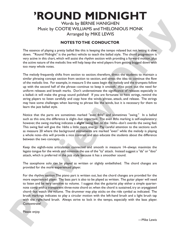 "'Round Midnight" is a jazz classic now available in an arrangement correlated to the Jazz Expressions™ curriculum. The focus of this chart is teaching the traditional ballad style to the young player with legato melodic phrases, smooth phrasing articulations, a lyrical solo for 1st alto saxophone (written or ad-lib), and accessible ranges set in a slow swing feel. Optional parts for flute, clarinet, horn, baritone horn, tuba, AND violin, viola and cello. (3:46)