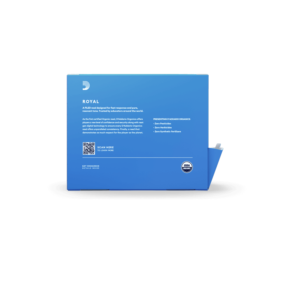 Royal Organic Reeds by D’Addario are ideal for both beginning and advancing players. These reeds feature a filed cut for additional tonal clarity, and a traditional blank and profile to give you an ease of response when playing. Each reed in the pack comes individually-sealed in a recyclable paper reed holder and flow wrap.