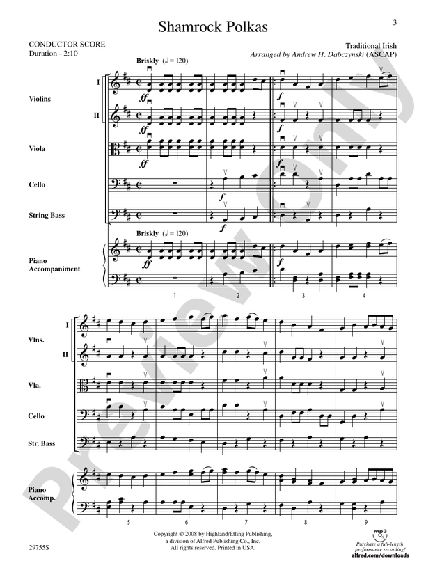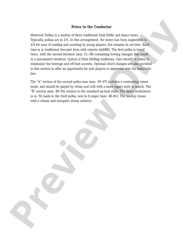 It seems like everyone enjoys a good polka! Shamrock Polkas is a medley of three traditional Irish dance tunes that will quickly become favorites of students and audience alike. The parts are creatively arranged so the rhythms are easy to read and the notes fall under the fingers, making this piece playable even by an intermediate level string orchestra. Yet the compelling polka melodies will also attract advanced students as they are challenged by optional improvisation opportunities and "up-tempo" possibilities. This bright arrangement---with melodies shared by all the instruments above a memorable bass line---will complement any concert program. It's sure to bring the audience to its feet---to applaud and to dance! (2:10)