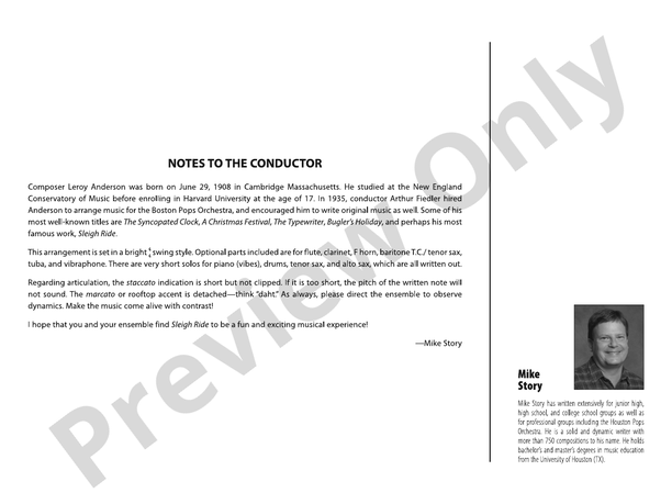 The classic holiday tune scored for young band accessibility. "Sleigh Ride" arranged by Mike Story includes written melodic solos for alto and tenor sax, easy brass ranges, simple rhythms, and all the optional parts to include flute, clarinet, and vibraphone. Ride on! (2:13)