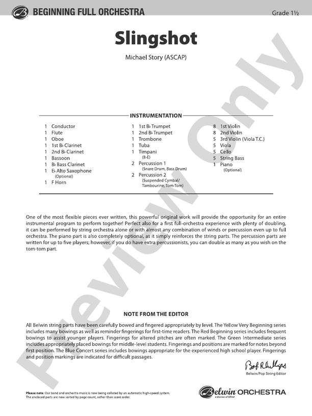 One of the most flexible pieces ever written, this powerful original work by Michael Story will provide the opportunity for an entire instrumental program to perform together! Perfect also for a first full orchestra experience with plenty of doubling, it can be performed by string orchestra alone or with almost any combination of winds or percussion. The piano part is also completely optional, as it simply reinforces the string parts. The percussion parts are written for up to five players; however, if you have extra percussionists, you can double as many as you wish on the tom-tom part. (1:30)
