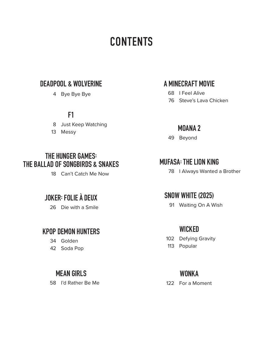 Play the soundtrack of today's biggest movies! Bring the magic of the movies to life with this exciting collection of 16 unforgettable songs from today’s top films. From the enchanting world of Wicked to the action-packed fun of KPop Demon Hunters and Minecraft, these fan-favorite hits are arranged for piano, voice, and guitar. Each arrangement includes chord symbols, guitar chord frames, and complete lyrics, making it easy to play and sing along.
