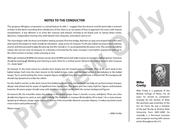Arranged especially for the USAF Airmen of Note, this alto ballad is outstanding in every respect. The introduction features 'bones playing the bridge, followed by the A section statement with alto and piano, development, alto solo space, some double time sections, back to the ballad tempo, and a big ensemble ending. Lead trumpet range to written high E-flat. Includes optional 5th trumpet part.