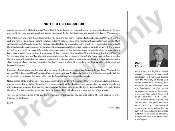 This pop/funk hit still kicks. At 96 BPM it's solid gold from top to bottom with a written or ad-lib tenor sax solo, lead trumpet range is to written F-sharp top line, and has the usual optional parts to include vibes. The title says it all, it is a Soulful Strut.