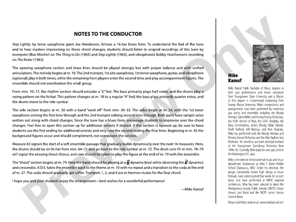 An outstanding swing chart that is accessible in every way. The melody is stated by alto, tenor, and trumpet; the tempo is 120 BPM; and the lead trumpet range is to written G on top of the staff. This chart includes written-out suggested solos for tenor 1 and trumpet 2, a sweet shout chorus, and all the usual optional parts plus vibes and clarinet.