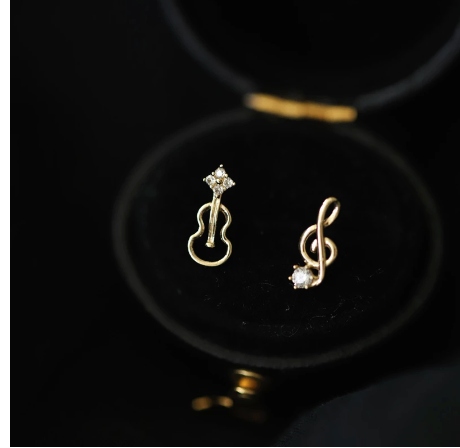 Sterling Silver 14ct Gold Plated Stud Earrings Violin and Treble Clef with a Diamonte
