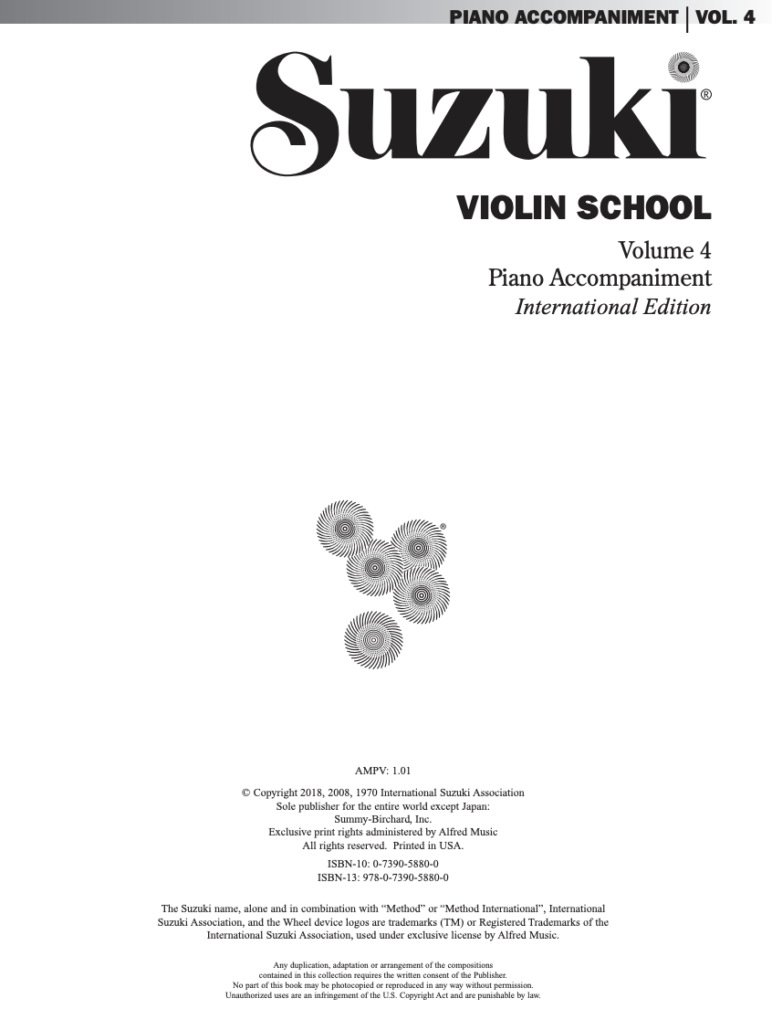 Teach violin with the popular Suzuki Violin School. The Suzuki Method® of Talent Education is based on Shinichi Suzuki's view that every child is born with ability, and that people are the product of their environment. According to Shinichi Suzuki, a world-renowned violinist and teacher, the greatest joy an adult can know comes from developing a child's potential so he/she can express all that is harmonious and best in human beings. Students are taught using the "mother-tongue" approach. Each series of books for a particular instrument in the Suzuki Method is considered a Suzuki music school, such as the Suzuki Violin School. Suzuki lessons are generally given in a private studio setting with additional group lessons. The student listens to the recordings and works with their Suzuki violin teacher to develop their potential as a musician and as a person. This Suzuki piano accompaniment book aids in Suzuki violin lessons.