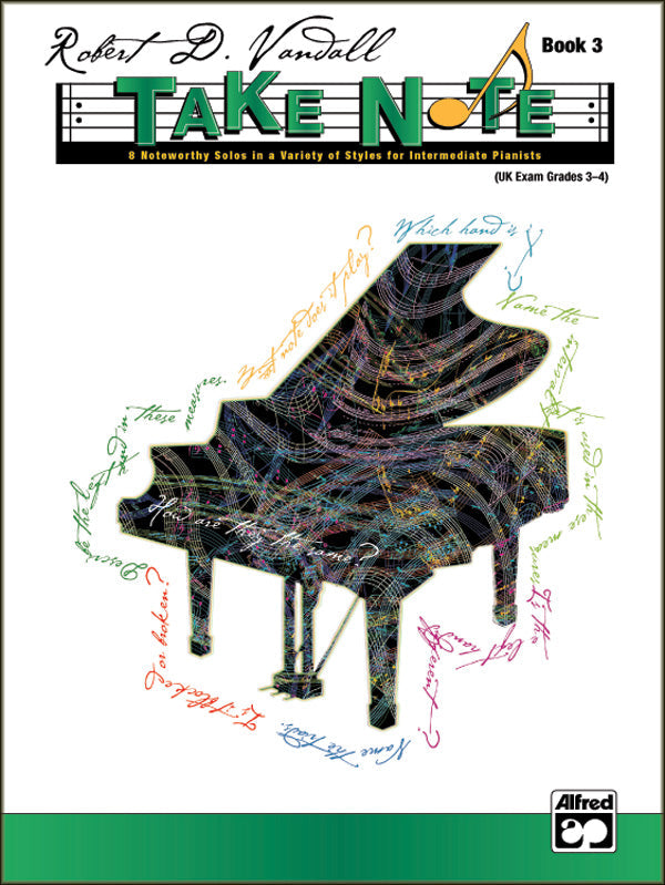 The Take Note series is Robert Vandall's first collection of solos with Alfred. Each book is full of varying styles, keys and tempos. A special "Take Note" section is included for each piece to help students identify musical patterns and theoretical concepts, leading to effective study, practice and music-making! Book 3 has 8 solos. Titles: Autumn Winds * Great Day! * Joybells * Lights in the Water * Pinwheels * Power Moves * Purple Sunrise * Saying Goodbye.