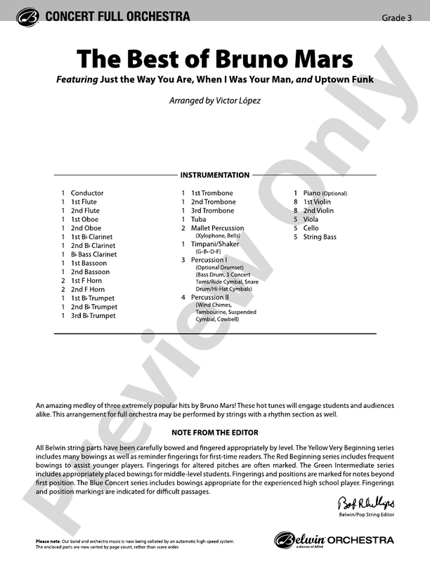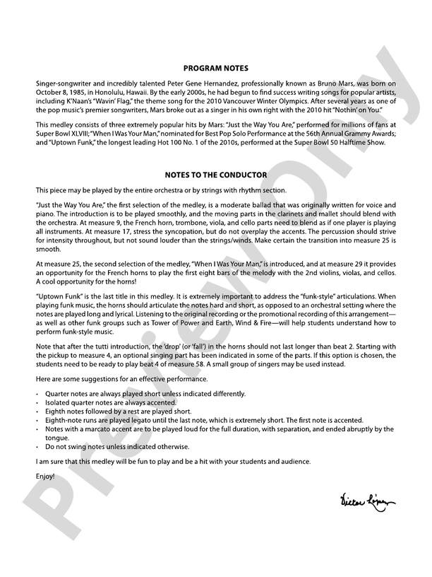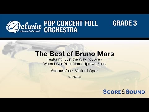 The Best of Bruno Mars features an amazing medley of three extremely popular hits by Bruno Mars! These hot tunes will engage students and audiences. This medley includes "Just the Way You Are," performed for millions of fans at Super Bowl XLVIII; "When I Was Your Man," nominated for Best Pop Solo Performance at the 56th Annual Grammy Awards; and "Uptown Funk," the longest leading Hot 100 No. 1 of the 2010s, and performed at the Super Bowl 50 Halftime Show. This piece may be played by the entire orchestra or by strings with rhythm section.