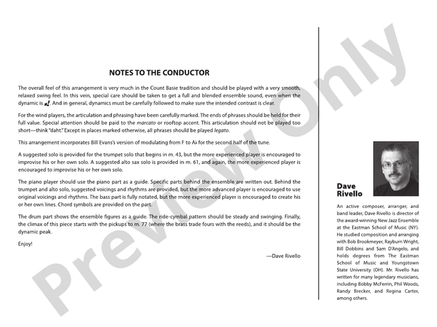 You know this great standard, but check out how the chart goes back and forth from F to A-flat. The swing feel is around 148 BPM, solos are written for trumpet 2 and alto, lead trumpet hit a written B-flat above the staff, and the vibe part will add a nice texture to the ensemble. Dave Rivello's arrangement of The Days of Wine and Roses is superb!(3:12)