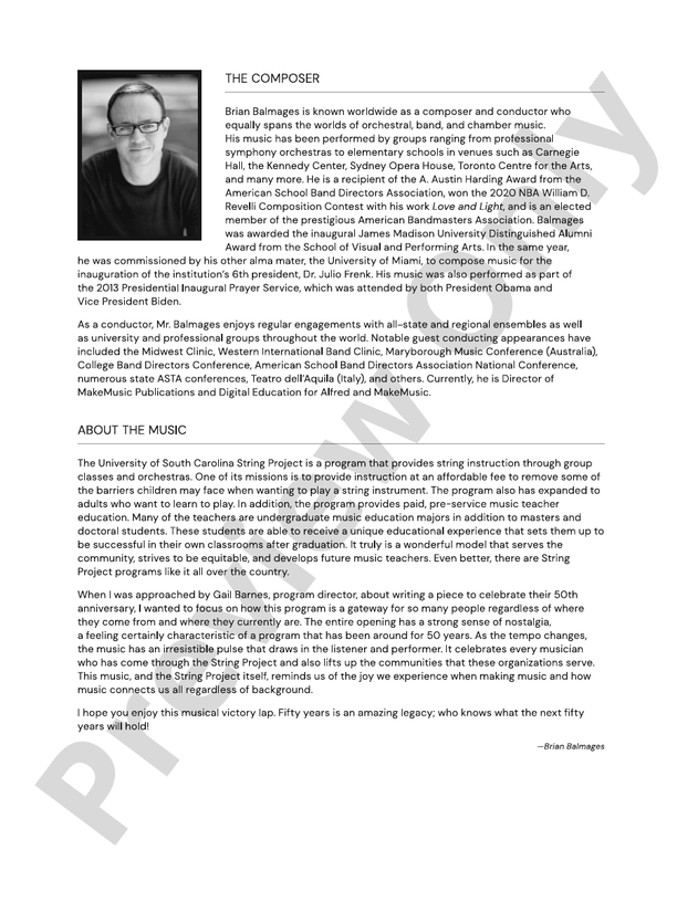 Celebrate music and its ability to connect with communities around us! This joyful work by Brian Balmages is a powerful reminder of the many ways music inspires and invigorates. Beginning with a beautiful, heartfelt introduction, The Golden Gateway soon takes off in exuberant twists and turns before coming to a heroic conclusion. (5:20)