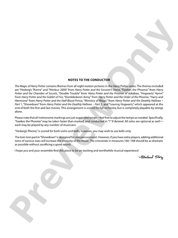 The Magic of Harry Potter contains themes from all eight motion pictures in the Harry Potter series. The themes included are "Hedwig's Theme" and "Nimbus 2000" from Harry Potter and the Sorcerer's Stone, "Fawkes the Phoenix" from Harry Potter and the Chamber of Secrets, "Double Trouble" from Harry Potter and the Prisoner of Azkaban, "Hogwarts' Hymn" from Harry Potter and the Goblet of Fire, "Dumbledore's Army" from Harry Potter and the Order of the Phoenix, "Harry and Hermione" from Harry Potter and the Half-Blood Prince, "Ministry of Magic" from Harry Potter and the Deathly Hallows -- Part 1, "Showdown" from Harry Potter and the Deathly Hallows -- Part 2, and "Leaving Hogwarts," which appeared at the end of both the first and last movies. This arrangement is scored for full orchestra, but is completely playable by strings alone. (6:00)