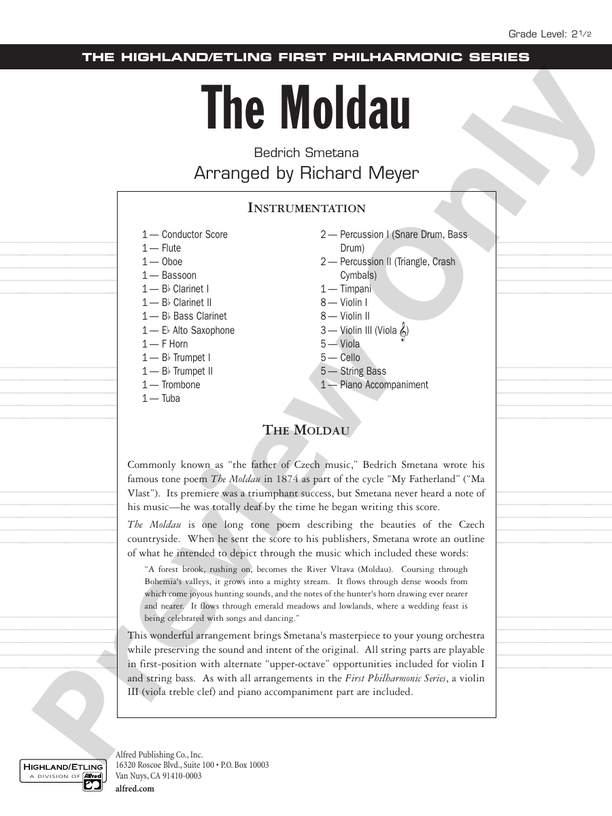 The wonderful arrangement brings Bedrich Smetana's masterpiece to your young orchestra while preserving the sound and intent of the original. All string parts are playable in first position with alternate "upper octave" opportunities included for Violin I and String Bass. As with all arrangements in the "First Philharmonic " Series, a Violin III (Viola treble clef) and Piano Accompaniment part are included. (5:00)