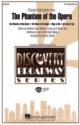 Younger choirs can now enjoy the powerful and dramatic music from the celebrated Andrew Lloyd Webber musical with this medley of highlights fromthe show. Includes: All I Ask of You, The Music of the Night, The Phant om of the Opera, Think of Me. Available: 2-Part, 3-Part Mixed, ShowTrax CD. Performance Time: Approx. 6:40.