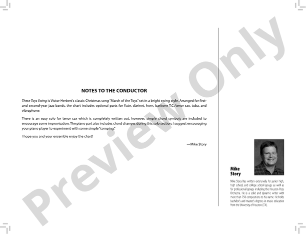 These Toys Swing arranged by Mike Story is a superb grade 1 chart based on "March of the Toys." Trumpet 1 range to written E top space, a written-out tenor sax 1 solo, and well-notated rhythm section parts played at 144 BPM. The perfect holiday chart! (2:19)