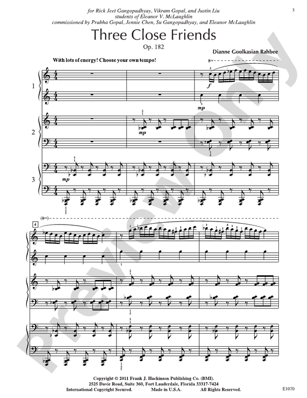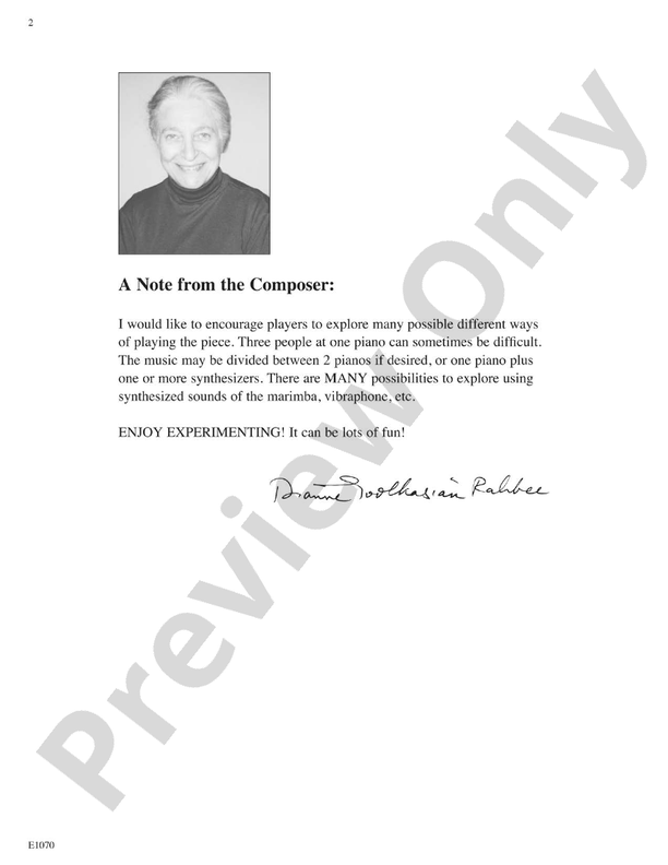 Full of energy and fun to play, this percussive, patterned piece was commissioned for three young students (ages 10-12) who are best friends and have performed this piece many times to enthusiastic audiences. The tempo mark is "choose your own"? with the eighth note being the prevalent note value. The middle section is marked espressivo and the quarter notes slow it down. Ensemble is a challenge, but each part is highly patterned and easy to learn.
