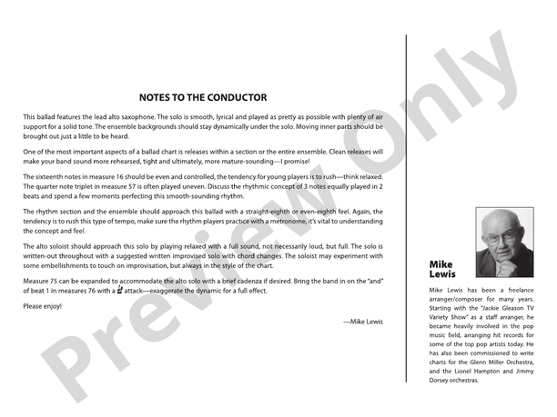 It's ballad time. This chart will provide your alto player with the perfect alto sax ballad. Everything is very playable for young players---the melody is beautiful and lyrical, harmonies are lush, rhythms are easy, and lead trumpet range is to fourth space E.