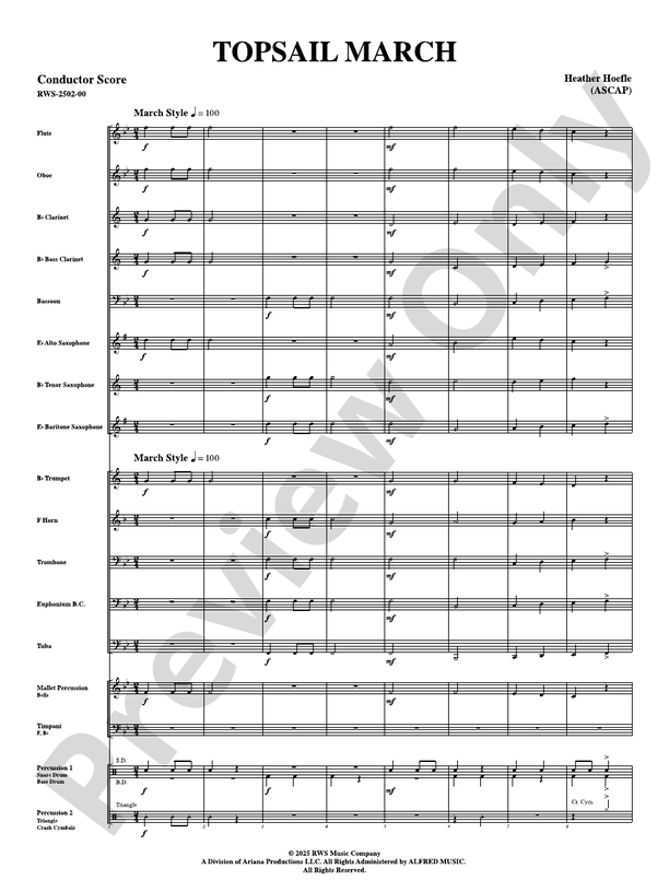 Open your beginning band's next concert or festival with the bold and confident Topsail March (pronounced Tops'l). This spirited 2/4 march by Heather Hoefle helps young musicians develop march style while using only the first six notes, making it an excellent choice for building fundamental skills and delivering a strong performance. (1:20)