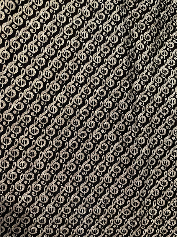 This bag is made from an elegant fabric design that features small silver treble clefs on a black background, complete with black shoulder strap.
