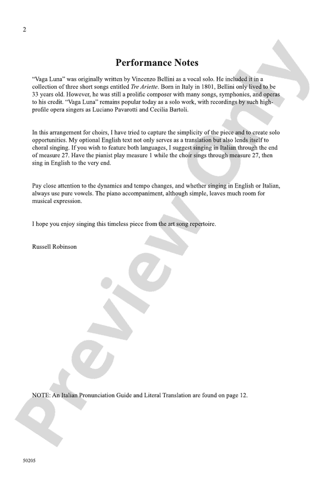 All the bel canto beauty of Bellini's graceful art song is captured in this elegant choral adaptation by Dr. Robinson. Expressive dynamic and tempo changes create opportunities for nuance. Whether singing in Italian, English, or a combination of both, a pronunciation and translation guide is included in the publication for ease of learning.