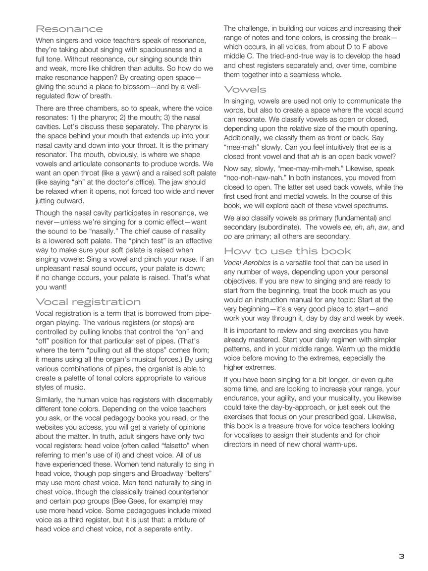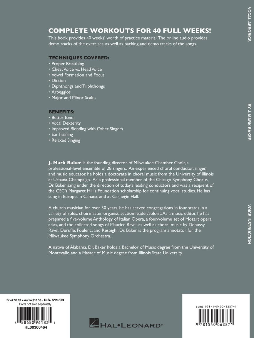 Vocal Aerobics provides 40 weeks worth of practice material. The online audio provides demo tracks of the exercises, as well as backing and demo tracks of the songs. Techniques covered include: proper breathing; chest voice vs. head voice; vowel formation and focus; diction; diphthongs and triphthongs; arpeggios; major and minor scales. Benefits from this complete set of workouts include: beter tone; vocal diversity; improved blending with other singers; ear training; and relaxed singing. The audio features professional musicians performing each track. The audio is accessed through Hal Leonard's popular MyLibrary system using the provided code. The audio can be streamed or downloaded and includes PLAYBACK+, a multi-functional audio player that allows you to slow down audio without changing pitch, set loop points, change keys, and pan left or right.