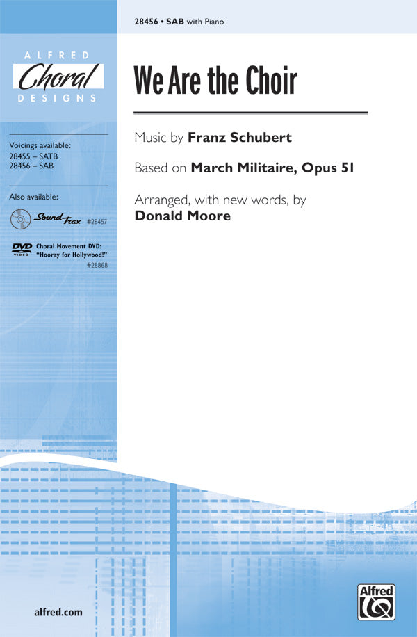 The music is Schubert's "March Militaire." The text is wonderfully witty. The result is an unforgettable novelty number for mixed choirs. Each section of the choir brags about being "the very best in town" or having "the finest sound" in the chromatic B section, before recapitulating the strong "we are the choir" hook. Funny (to hear) . . . and fun (to sing)! Featured on the "Hooray for Hollywood!" movement DVD #28868.