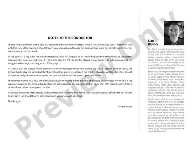 Yes! Alan Baylock's arrangement of What Is This Thing Called Love? is a hot swinger played in double time around 110 BPM that alternates with a samba groove. A terrific jazz standard that is full of energy that features solo work for tenor 1 (sample solo provided) and drum solo fills in an interlude. Lead trumpet range is to written A above the staff, optional parts include flute and vibes and more. This is your opener or closer for every performance! (4:15)