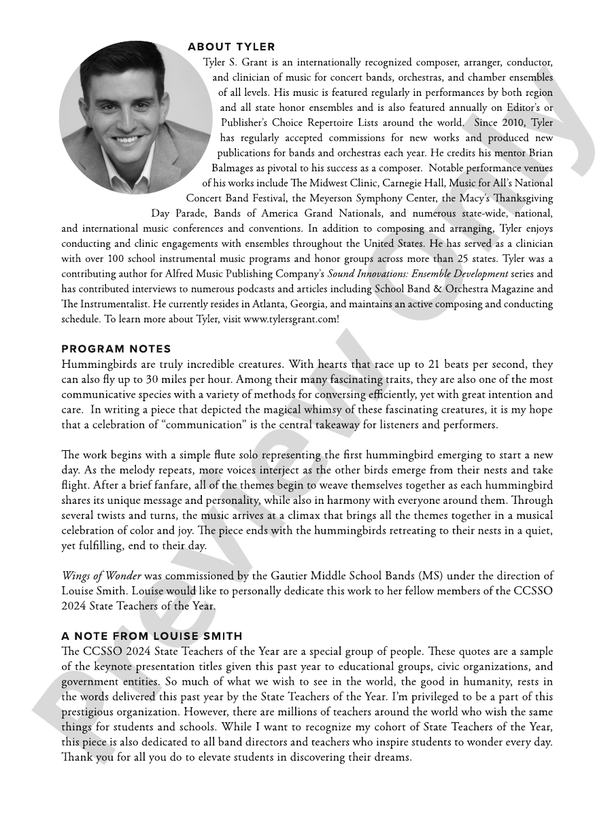Hope and joy are at the center of this charming work, inspired by the whimsical behavior of hummingbirds! Beginning with a melody that explodes into a flurry of activity, Wings of Wonder by Tyler S. Grant pairs light-hearted moments with powerful declarations. While very approachable, the colorful orchestration give this piece a uniquely sophisticated sound. Delightful! (2:45)